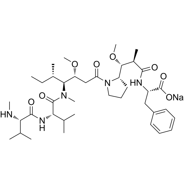 Monomethyl auristatin F (MMAF) sodium is a highly potent tubulin inhibitor and an antineoplastic agent used as a warhead in ADCs (antibody-drug conjugates) such as vorsetuzumab mafodotin and SGN-CD19A. MMAF plus its attachment structure to the antibody are referred to as mafodotin in the International Nonproprietary Names for MMAF-antibody-conjugates. Since the N-terminal amino group of MMAF only has one methyl substituent rather than two, as it does in auristatin F itself, it is actually desmethyl-auristatin F.