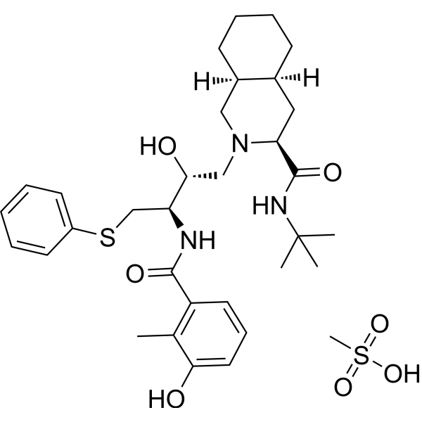 Nelfinavir Mesylate (AG 1343 Mesylate) is a potent and orally bioavailable HIV-1 protease inhibitor (Ki=2 nM) for HIV infection. Nelfinavir Mesylate (AG 1343 Mesylate) is a broad-spectrum, anticancer agent.
